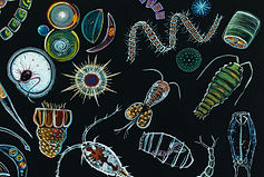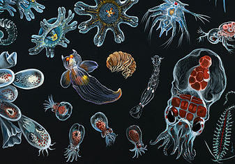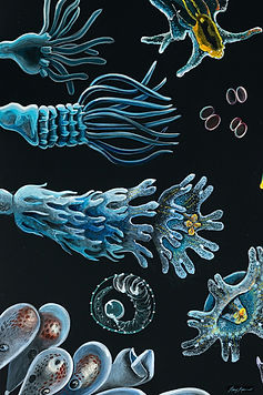 Plankton and sea life details are taken from a mural in the Point Defiance Aquarium Classroom. I was commissioned to paint two murals which show plankton from the Puget Sound and the mature animals that those plankton become.